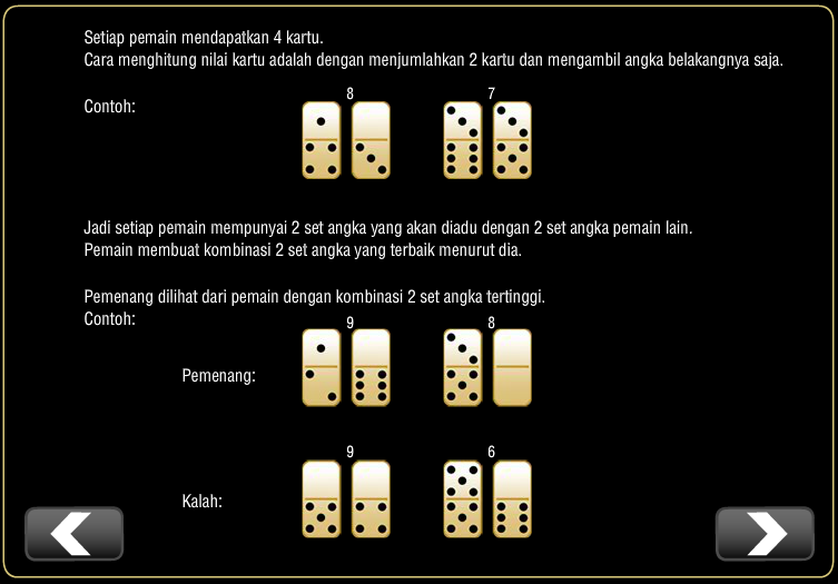 - Pemenang Permainan Domino KIU-KIU akan di lihat dari nilai kombinasi 2 pasang kartu yang tertinggi.
